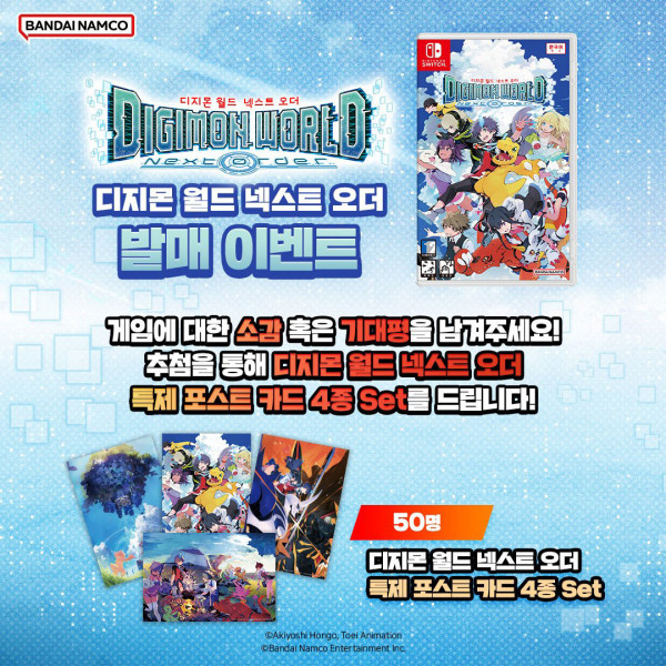 ‘디지몬 월드 넥스트 오더’(한국어판)의 발매를 기념해, 반다이남코 엔터테인먼트 코리아의 카카오톡 페이지(https://pf.kakao.com/_Wiyxcxb#none)에서 이벤트를 진행한다.