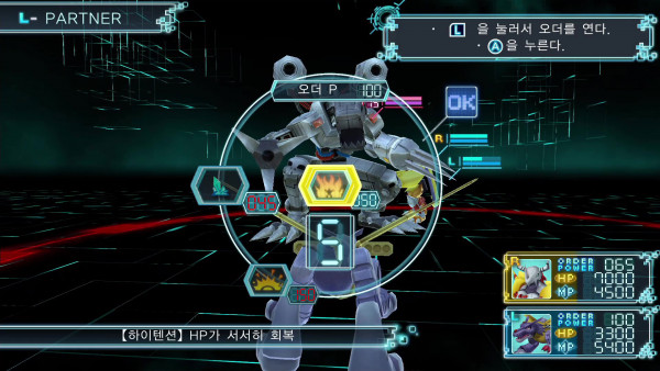전투 중 파트너 디지몬에게 성원을 보내면 ‘OP(오더 파워)‘가 쌓인다. 그 파트너가 기술을 성공했을 때나 아군을 보호했을 때 등 파트너가 좋은 동작을 했을 때 타이밍을 잘 맞춰서 성원을 보내면 더 많은 점수를 획득할 수 있다.