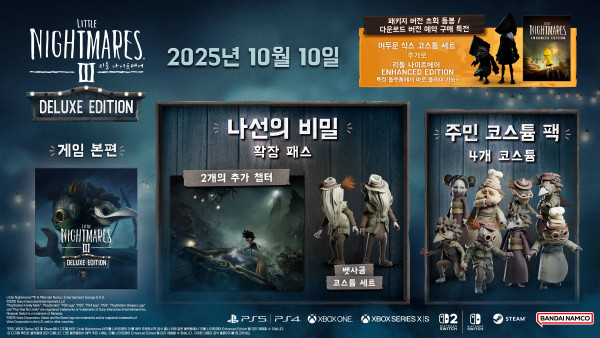 반다이남코 엔터테인먼트 코리아(지사장 장태근)는 PlayStation®5, PlayStation®4, Nintendo Switch 2, Nintendo Switch™, Xbox Series X|S, Xbox One, Steam®용 ‘Little Nightmares III(리틀 나이트메어 3)’(한국어판)을 발매한다고 발표했다.