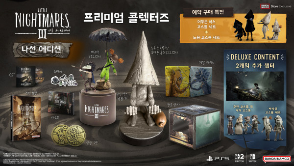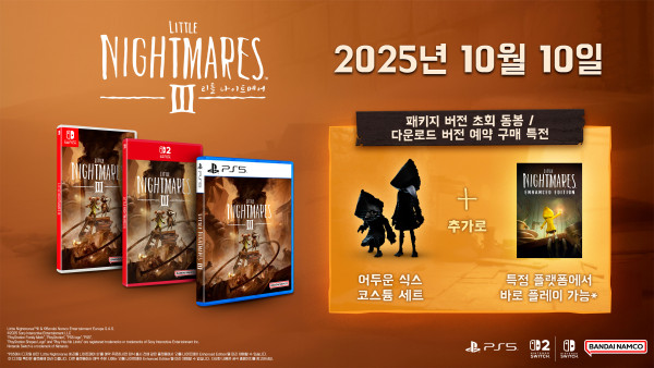 PlayStation®5, PlayStation®4, Xbox Series X|S, Xbox One, Steam®용 Little Nightmares III(리틀 나이트메어 3)’(한국어판)의 다운로드 버전 예약 판매가 시작되었다. Nintendo Switch 2, Nintendo Switch™의 다운로드 버전 예약 일정은 추후 공개된다.