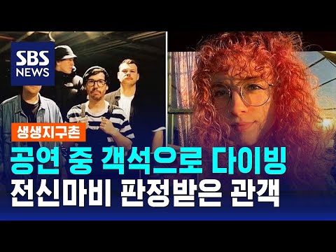 흥이 고조된 나머지 객석을 향해 몸을 던지는데, 그만 아래서 지켜보던 한 여성팬의 머리 위로 떨어지고 맙니다.