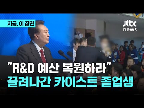 졸업생은 경호원들에 이끌려 행사장 밖으로 끌려 나갔는데요. 윤 대통령은 축사를 이어 가며 "과학 강국으로의 퀀텀 점프를 위한 연구개발(R&D) 예산을 대폭 확대하겠다"고 밝혔습니다.