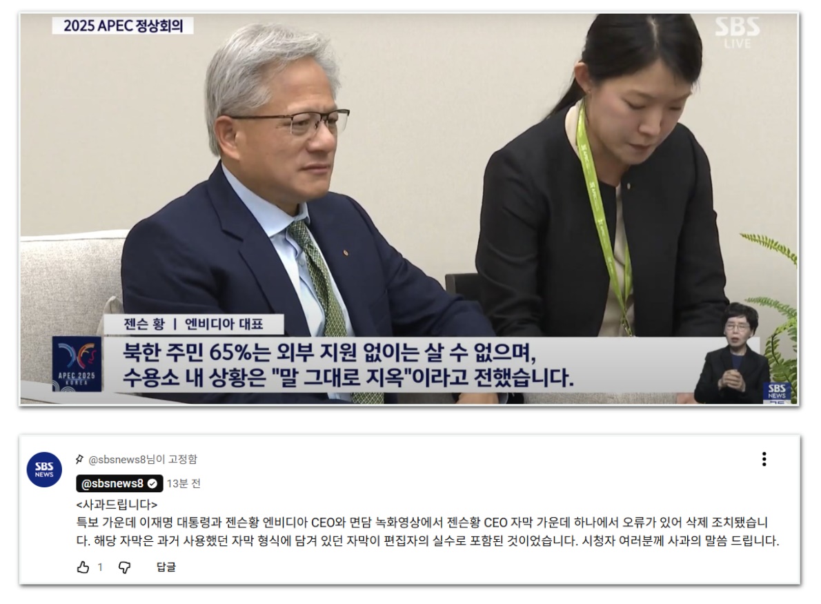 젠슨 황이 이 대통령에게 '북한 인권 지옥'? SBS 자막 오류
