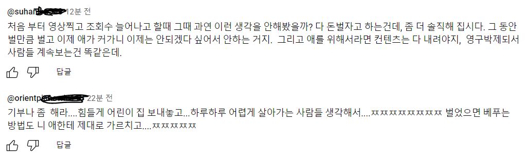 -그만두는거 응원합니다 정말 반가운 소식이네요 유튜브 그만하고 조용히 키우세요 제발 다시 재개 하지 마세요 잊혀지세요 다시는 세상에 나오지 마세요