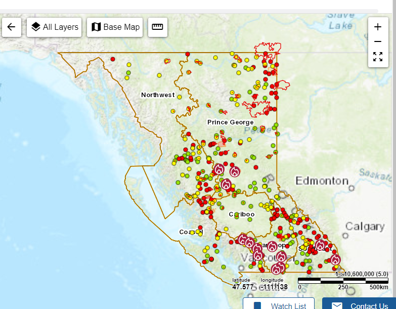 첨부한 첫번째 사진은 BC주에 현재 화재가 난곳들이죠..