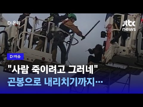 오늘(31일) 고공 농성을 하던 김준영 금속노련 사무처장이 진압 작전에 나선 경찰이 집단으로 휘두른 곤봉에 머리를 맞아 병원으로 이송됐습니다.