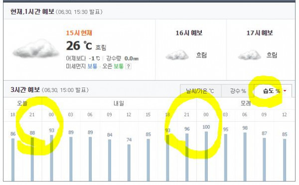 우리동네 습도좀 확인해봤음...지금 습도 표시도 뭔가 잘못된듯..  지금도 대략 90% 넘는듯 한데 ㅡㅡa..
