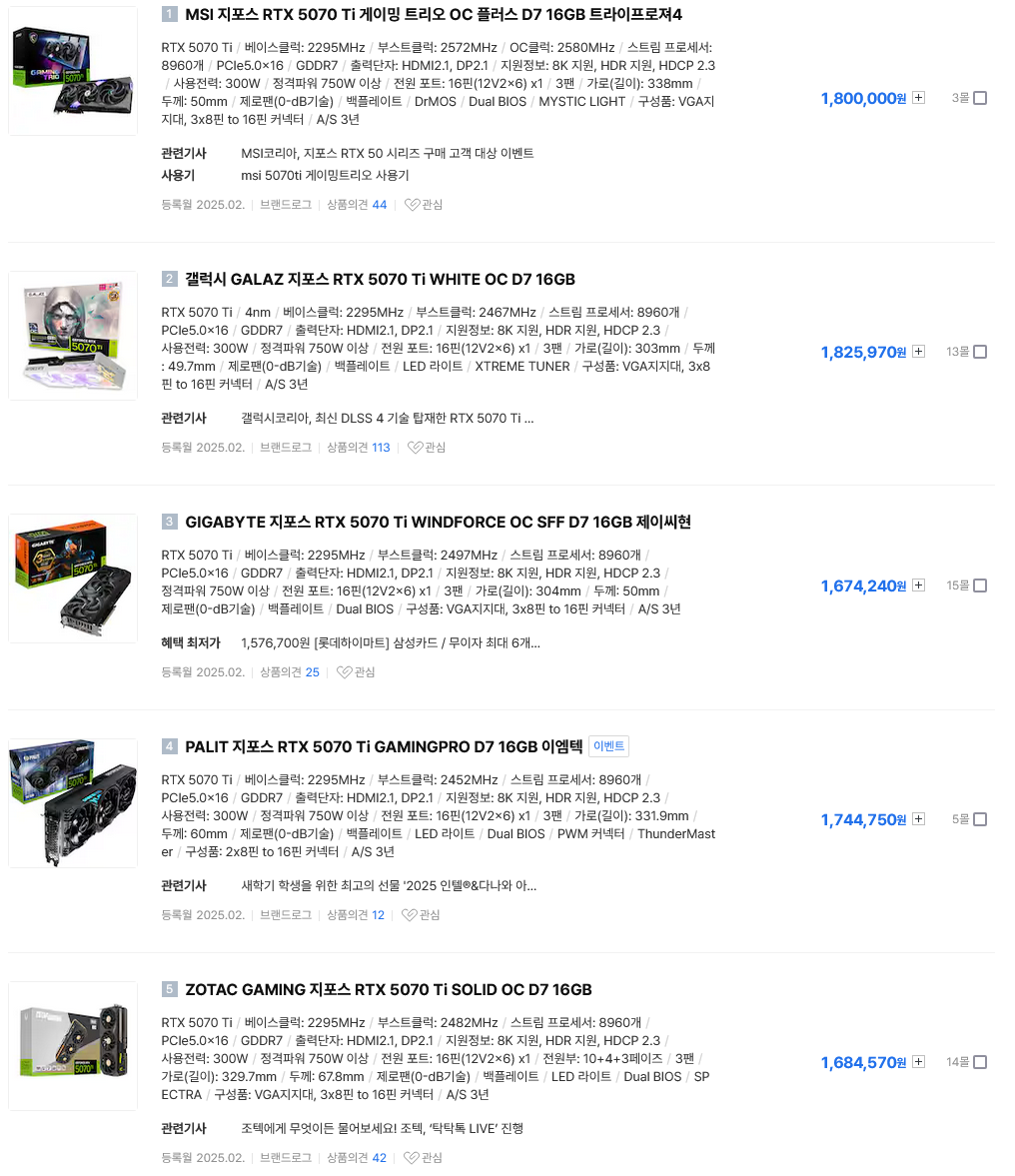 RTX 5080, 5090 하이엔드급은 여전히 n당 독점이지만,