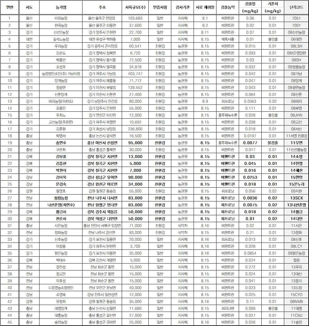 계란 살충제 검출 리스트... 97 HIKARU 담소 7 6475 0 2017.08.18 10:20 8월 17일 22시 현재 45곳..... 아직 저희 집 냉장고에 들어 있는 계란은 다행스럽게도....없네요...;;; 0 Author 4 3 Lv.97 97 HIKARU 최고관리자 640,305 (88.1%) 등록된 서명이 없습니다.