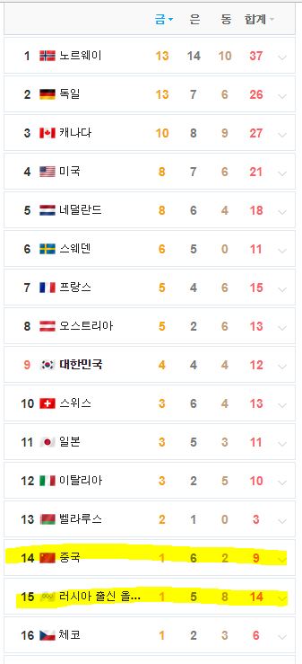 내일이면 끝나는군요 ㅡ..ㅡ.. M Max 담소 0 4894 0 2018.02.24 11:25 순위 현황 어떤가하고 들춰보니.............중국하고 러시아가.......헐~! ㅡ..ㅡ;;;;;거기다.. 의외로 방송이나 노출빈도로 보면 네덜란드가 뭔가 싹슬이 하는 분위기 였는데..1위는 노르웨이.....ㅡ..ㅡ... 0 Author 3 3 Lv.99 M Max 노땅클럽 968,705 (100%) 시간 참 빠르다~! ㅡ..ㅡy~!!
