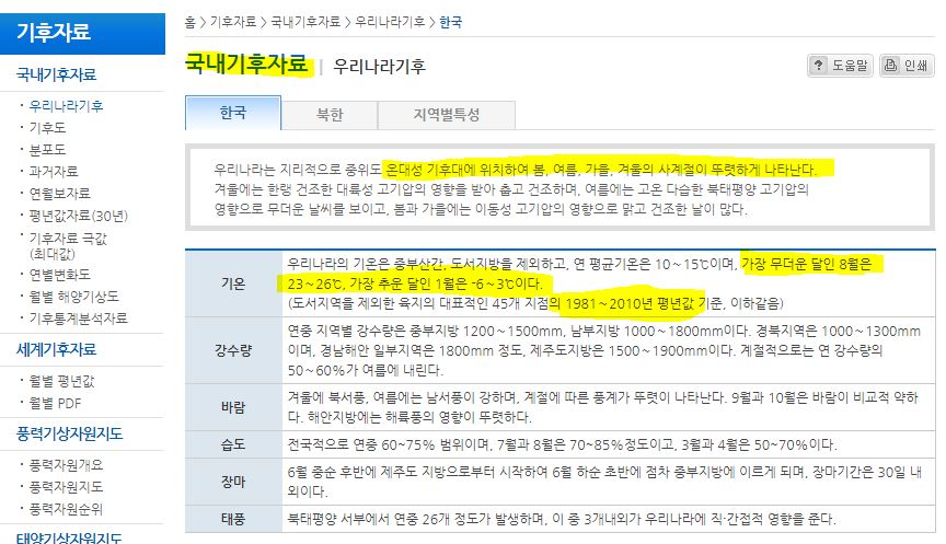 심심해서 찾아본... 국가공인 기상청 우리나라 기후 M Max 담소 0 3940 0 2018.08.22 21:53 이거 어디서 웃어야 될지 ㅡ..ㅡ..... 81년부터 2010년 평균치라는데... 2011년부터 2018까지 생각하면.... 실소만 나오는..압권은 바로 이대목~... "가장 무더운 달인 8월은 23∼26℃, 가장 추운 달인 1월은 -6∼3℃이다."2015년까지 데이터만 추가해도 저렇게는 못써놓을듯..~... 0 Author 3 3 Lv.99 M Max 노땅클럽 968,705 (100%) 시간 참 빠르다~! ㅡ..ㅡy~!!