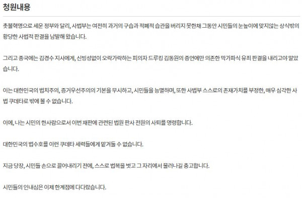 ‘시민의 이름으로 이번 김경수 지사 재판에 관련된 법원 판사 전원 사퇴를 명령합니다’라는 제목의 청원글이 게재됐다.