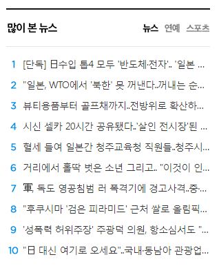 다음 vs 네이벼 M Max 담소 0 3829 0 2019.07.23 12:56 네이버 많이 본 뉴스에 같은 내용 기사가 주르륵.......이길레 다음도 그러나 해서 보니..네이버?? 정상인가??? 발악인가??.. 다음쪽 카테고리를 정치로 들어가 봐도 네이버 처럼은 안나오던 ...네이버다 음 0 Author 3 3 Lv.99 M Max 노땅클럽 968,705 (100%) 시간 참 빠르다~! ㅡ..ㅡy~!!
