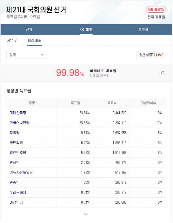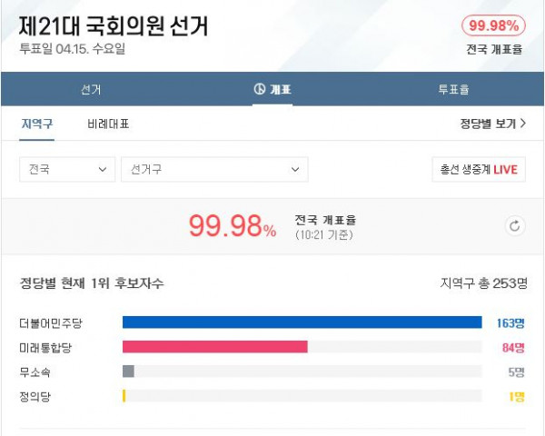 [21대] 총선 결과 M Max 정보 0 4211 0 2020.04.16 10:27 역시 변수는 사전투표!!지역구 비례 0 Author 3 3 Lv.99 M Max 노땅클럽 968,705 (100%) 시간 참 빠르다~! ㅡ..ㅡy~!!