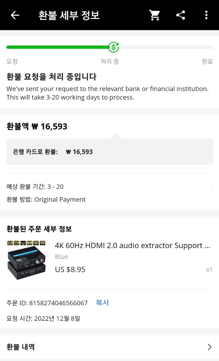 알리 반품 및 환불 완료... 97 HIKARU 담소 3 2506 0 2022.12.12 08:51 의외로 신속하게 됐음...그래도 한 10일 정도는 걸린 듯...그나저나, 이거 반품/환불하면서 주문했던 제품은 주문하고 8일 후에 발송...요즘 알리 대부분 주문하면 다음날이나 2~3일 안에 발송되는데...상점을 잘 못 고른 듯...이상없는 제품이 오기만을 바래야죠..뭐... 0 Author 4 3 Lv.97 97 HIKARU 최고관리자 640,225 (87.5%) 등록된 서명이 없습니다.