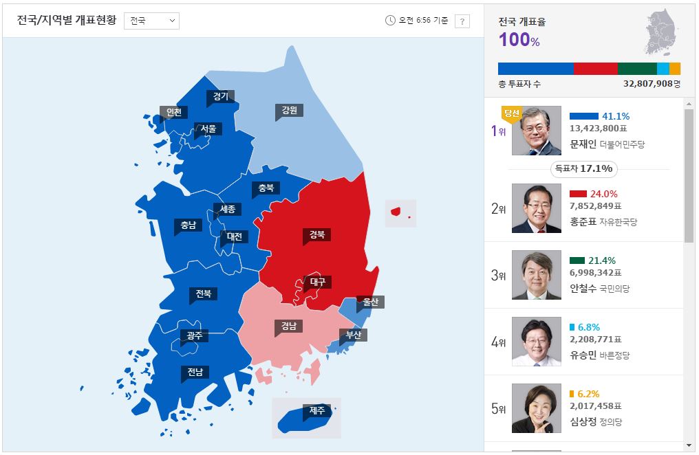 19대 대선 최종 개표 결과 M Max 정보 2 4860 0 2017.05.10 09:08 . 0 Author 3 3 Lv.99 M Max 노땅클럽 968,705 (100%) 시간 참 빠르다~! ㅡ..ㅡy~!!